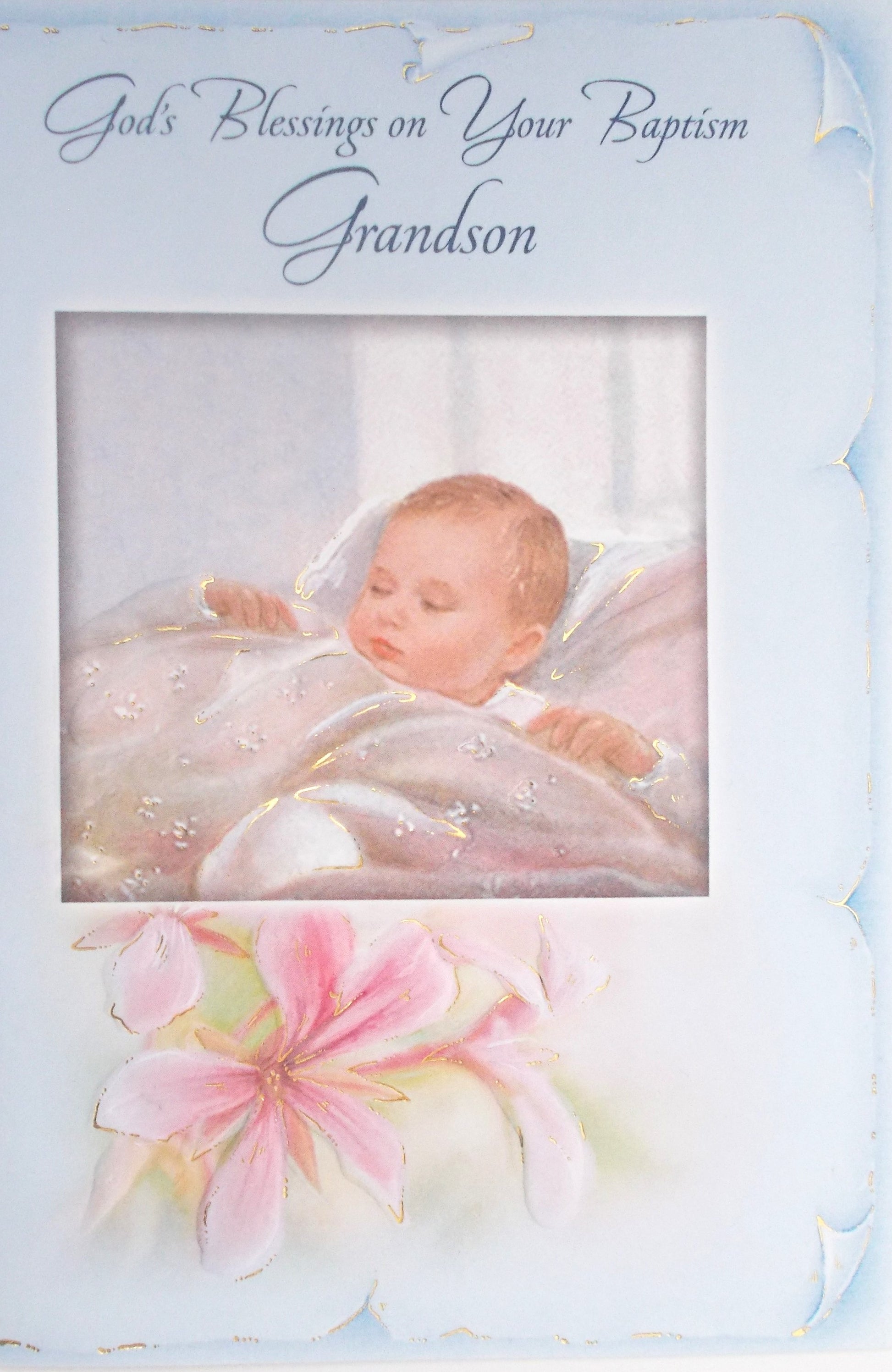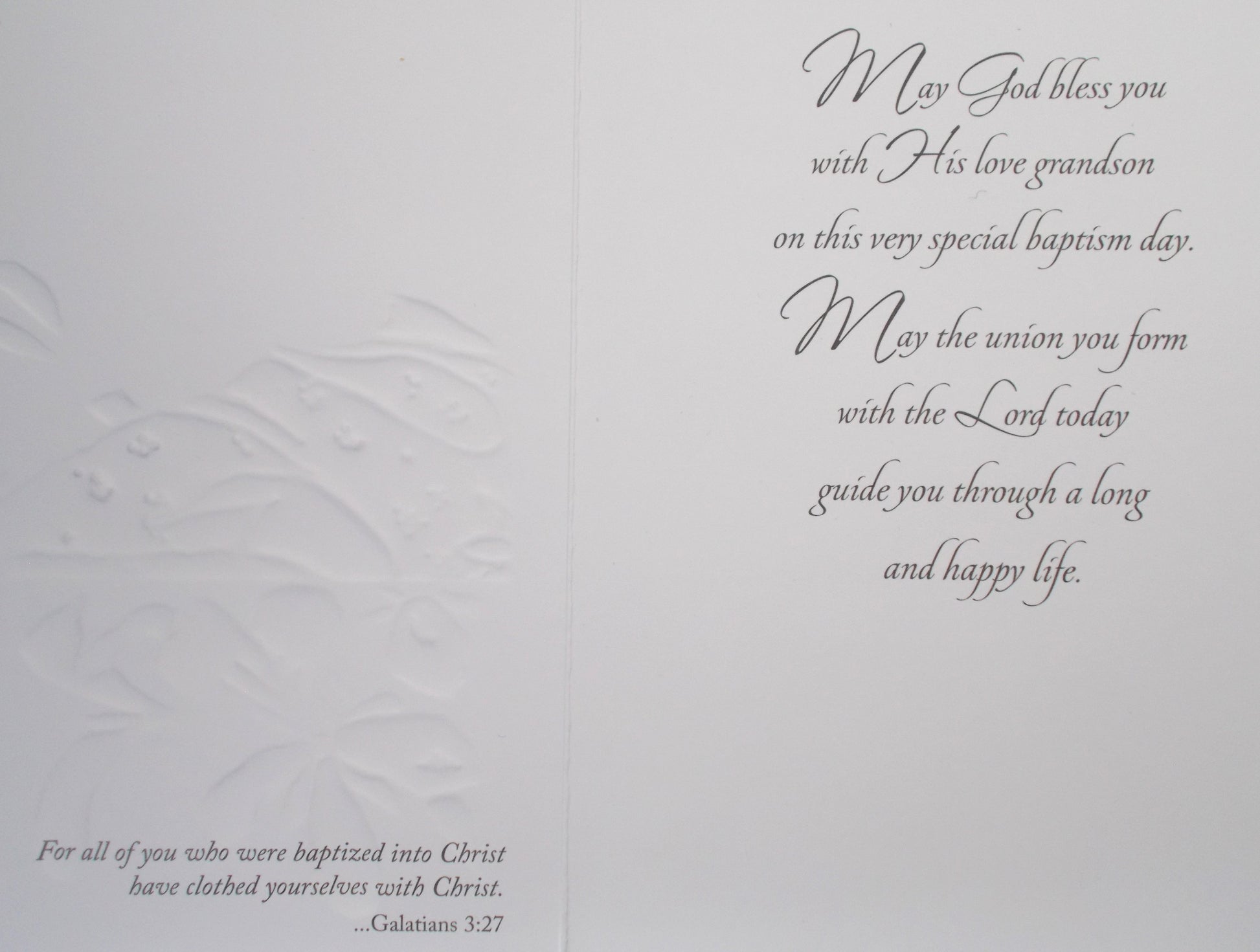 Inside Card : May God bless you with His love grandson on this very special baptism day. May the union you form with the Lord today guide you through a long and happy life.