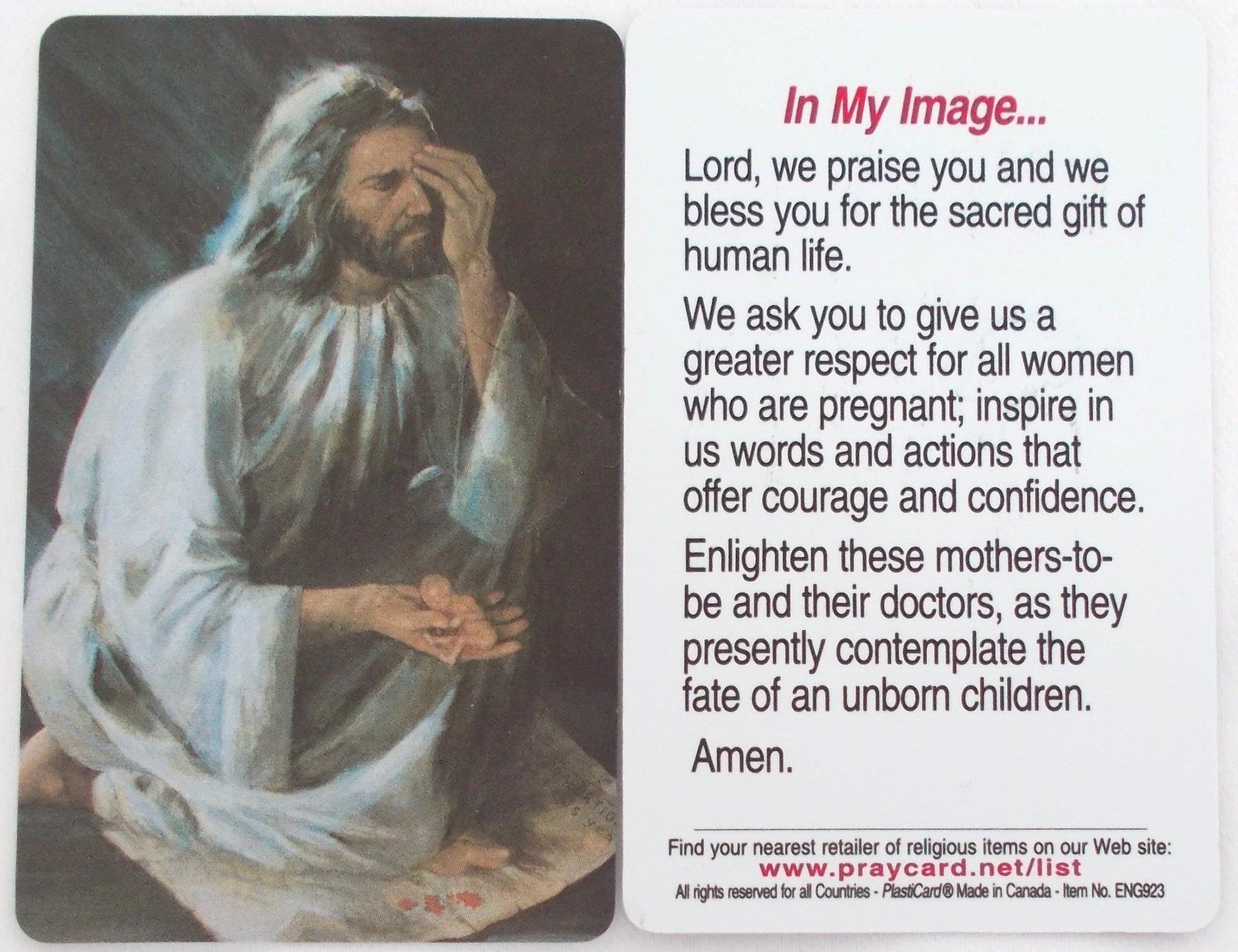 In My Image - Christ holding fetus - Unborn Prayer Plastic Prayercard measures 2 1/8 x 3 3/8 inches, front & back views of prayercard shown.