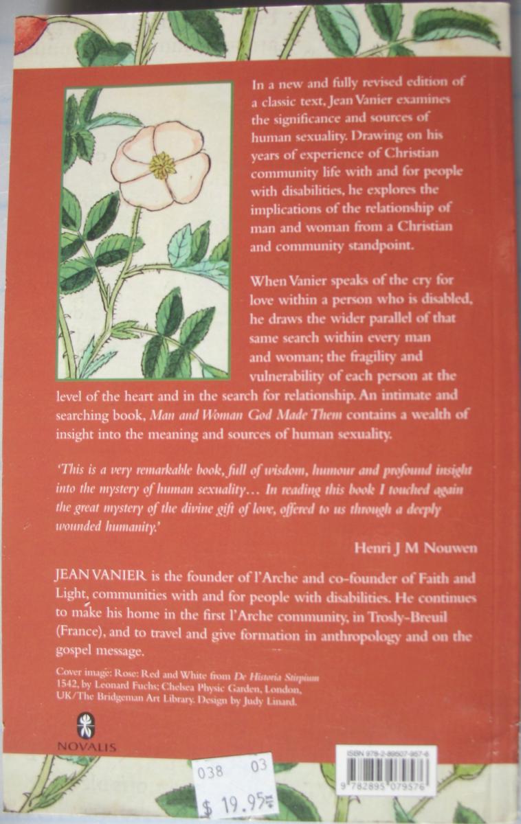 "In a new and fully revised edition of a classic text, Jean Vanier examines the significance and sources of human sexuality. Drawing on his years of experience of Christian community life with and for people with disabilities, he explores the implications of the relationship of man and woman from a Christian and community standpoint." Taken from back cover.