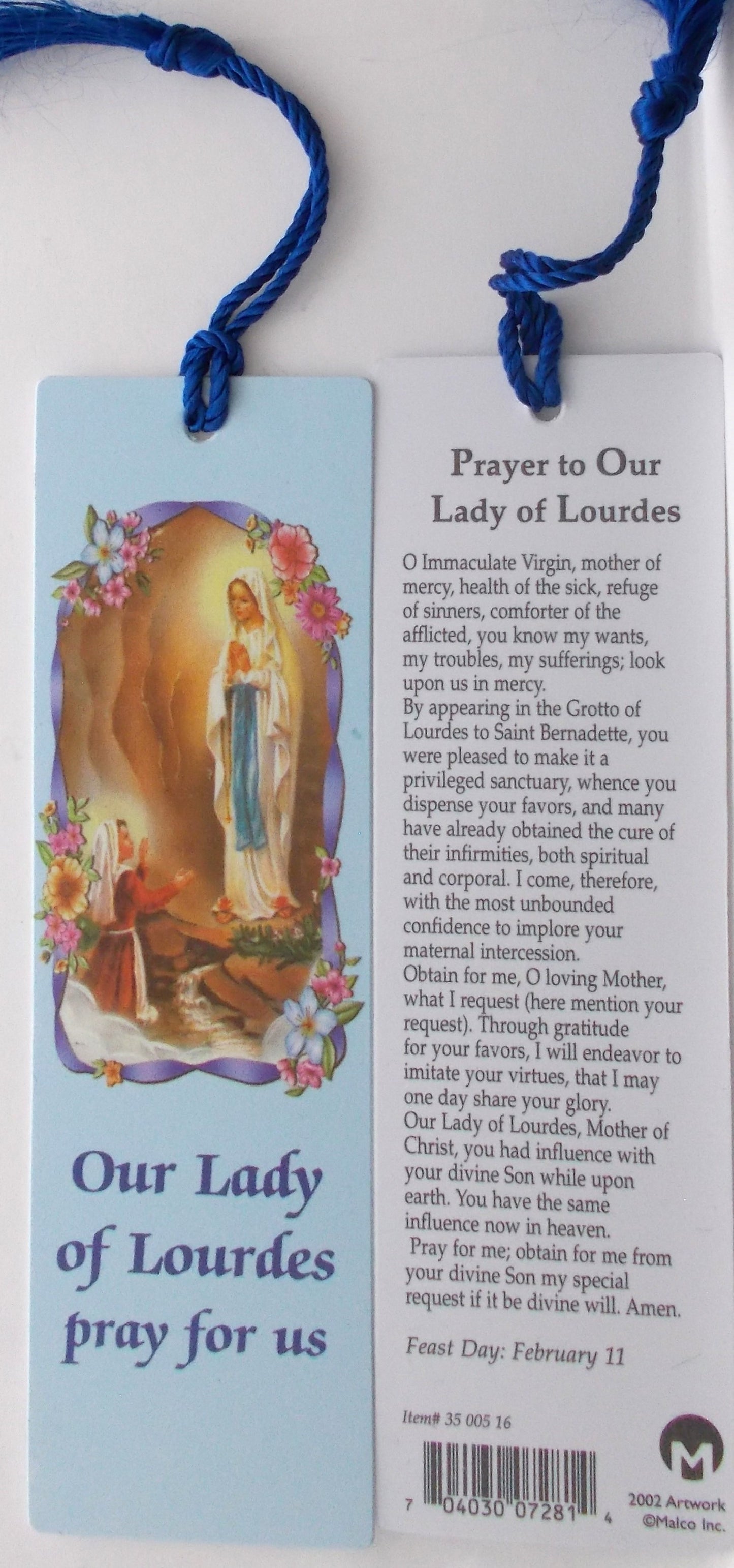 Plastic bookmark with tassel - Our Lady of Lourdes - measures 5 x 1 1/2 inches. front & back views shown.