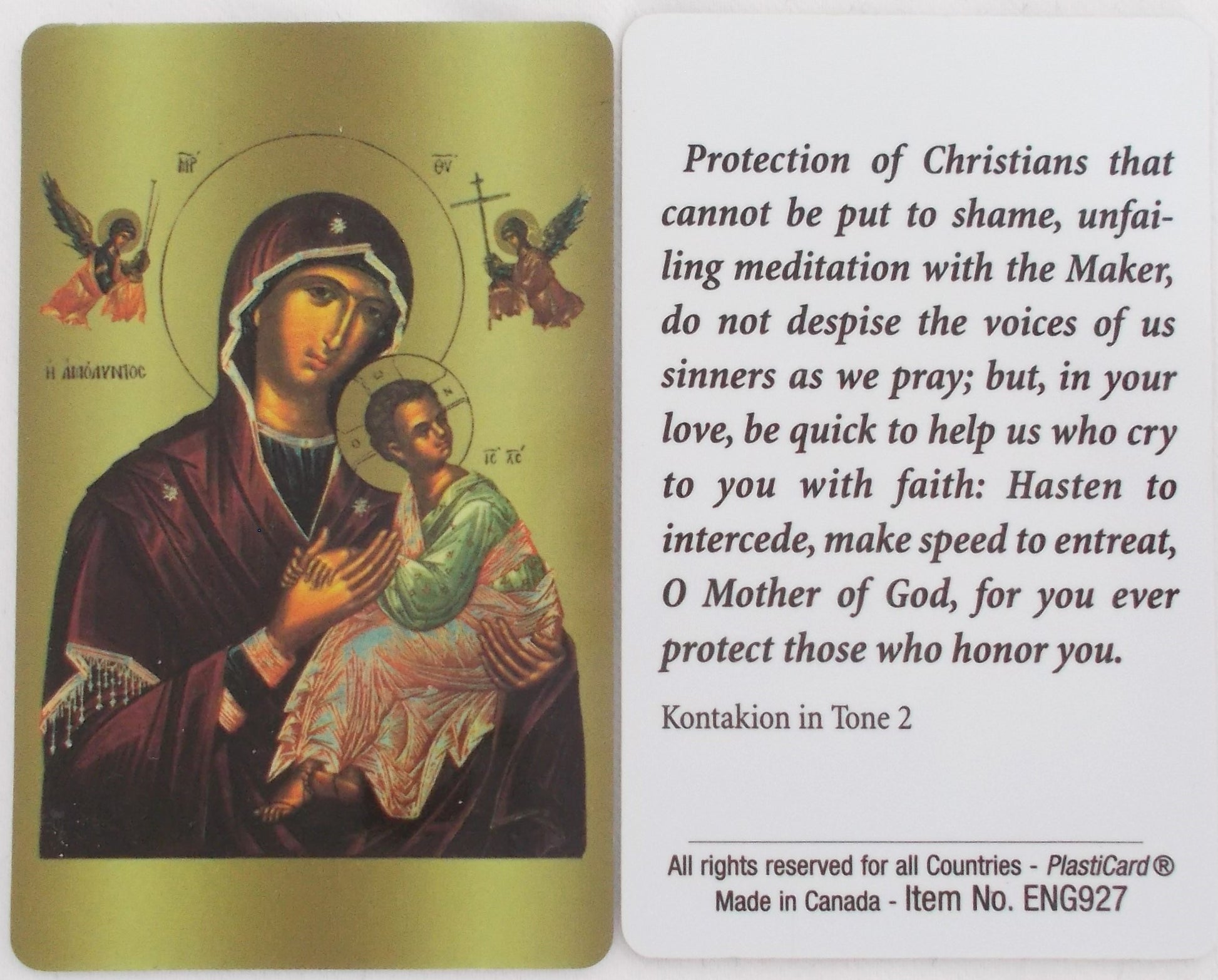 Our Lady of Perpetual Help Icon Prayer Plastic Prayercard measures 2 1/8 x 3 3/8 inches, front & back views of prayercard shown. Protection of Christians. With or Without Border.