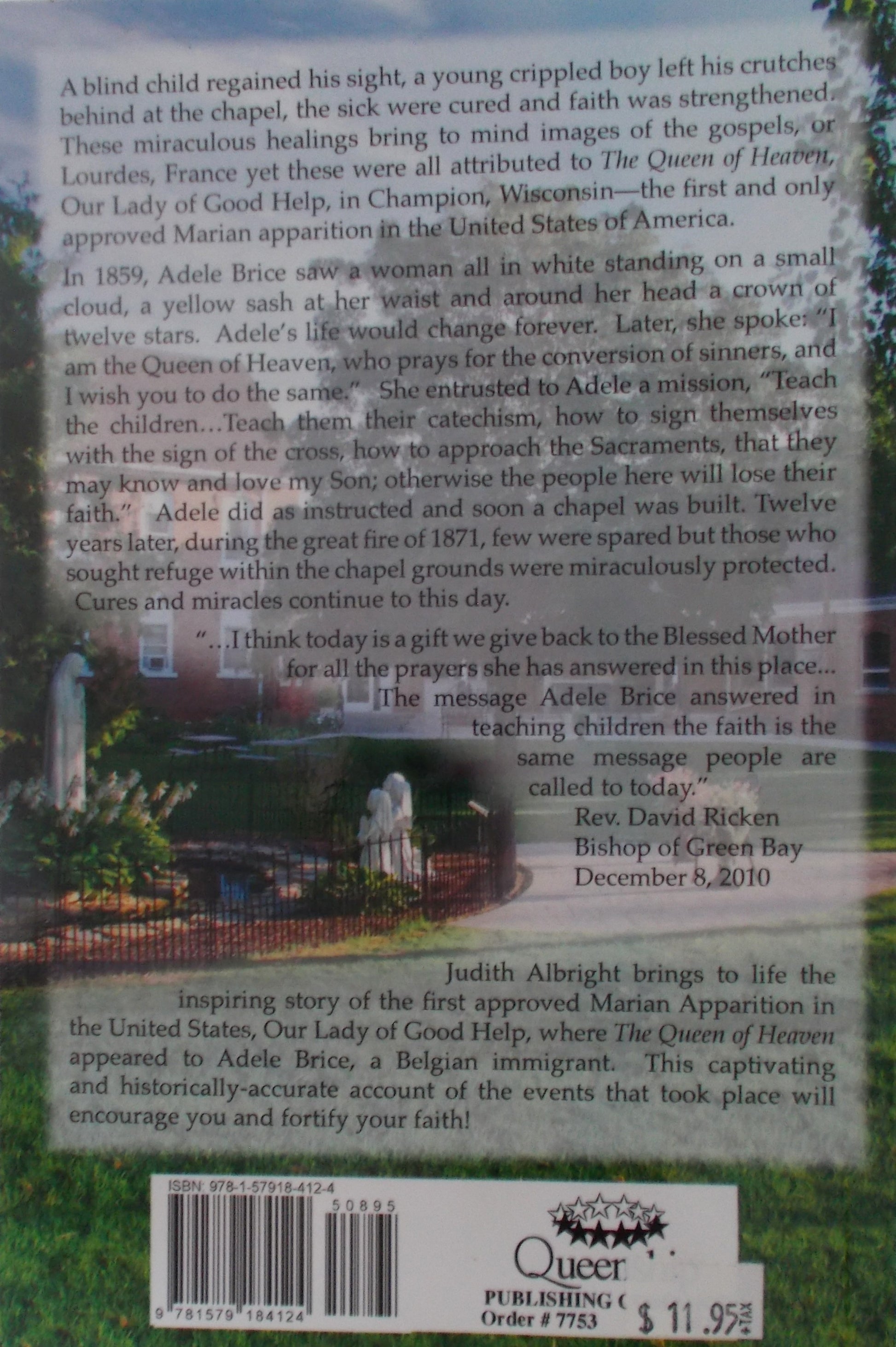 "Judith Albright brings to life the inspiring story of the first approved Marian Apparition in the United States, Our Lady of Good Help, where The Queen of Heaven appeared to Adele Brice, a Belgian immigrant. This captivating and historically-accurate account of the events that took place will encourage you and fortify your faith!" Taken from back cover.