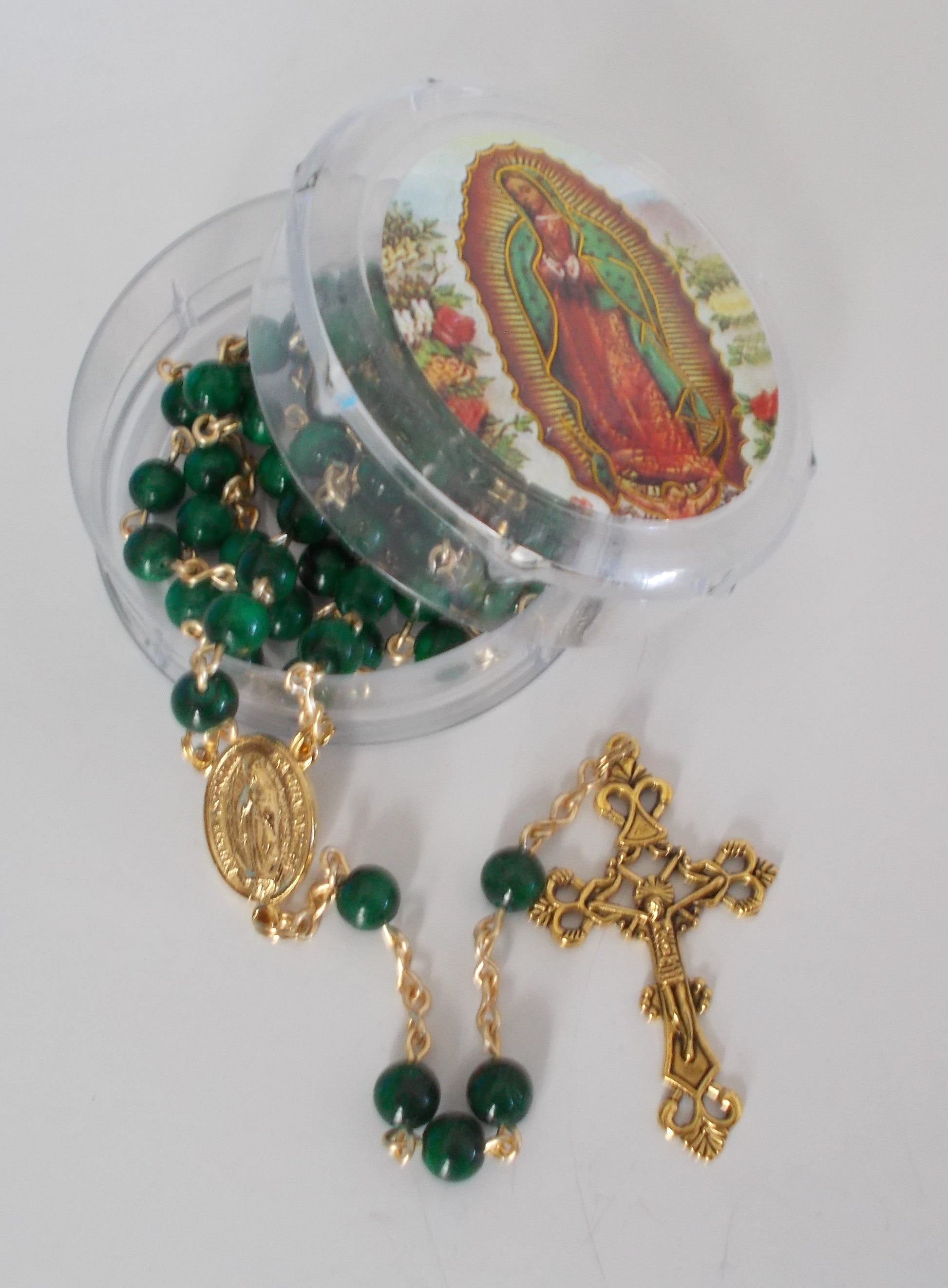 comes in 2 1/2 inch clear plastic two piece box with Our Lady of Guadalupe Image